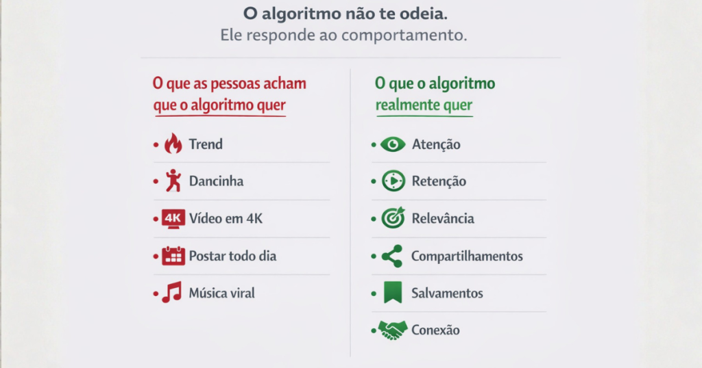 O algoritmo observa o comportamento das pessoas: quanto tempo elas assistem ao seu vídeo, se voltam para rever, se compartilham, se salvam, comentam e se interagem logo nos primeiros segundos. É por isso que o segredo está na estrutura, e não necessariamente no equipamento.